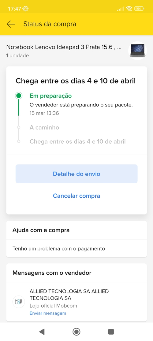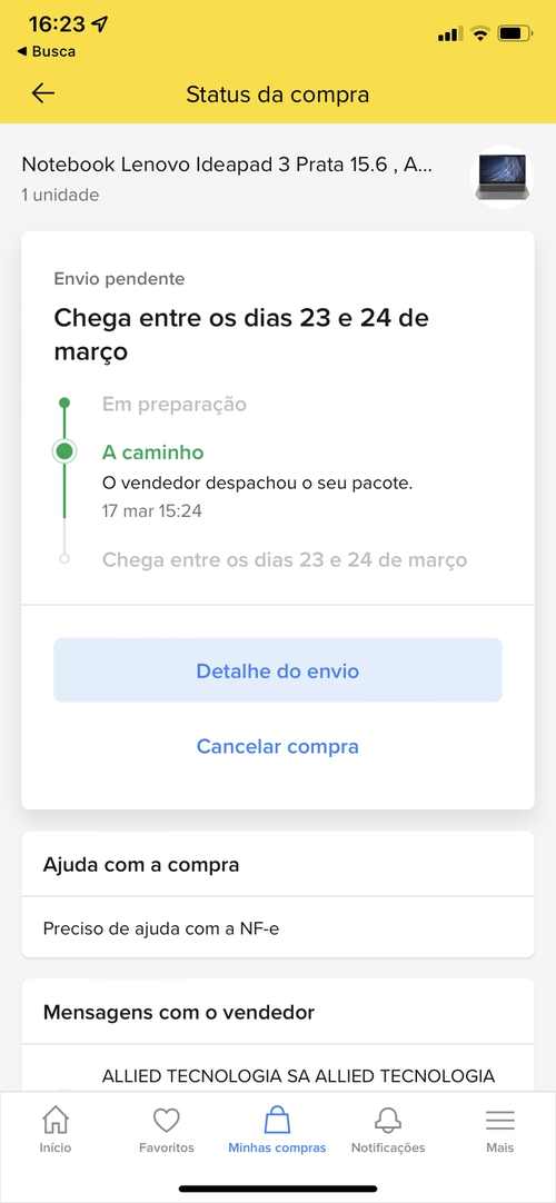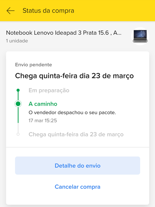 Tinha feito a compra umas 13:45 acho naquele dia. Depois de contato por email com um voucher com desconto comprei o mesmo note no site deles e saiu no mesmo preço do ML. Fiz em 10x normal e hoje notebook chegou lacradinho com cheiro de novo e com win11, no do ML era linux.