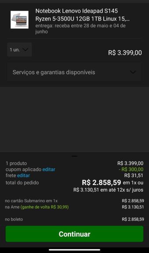 Notebook Lenovo Ideapad S145 Ryzen 5-3500U 12GB 1TB Linux 15,6 S145-15API 81V7S00000 R$2859