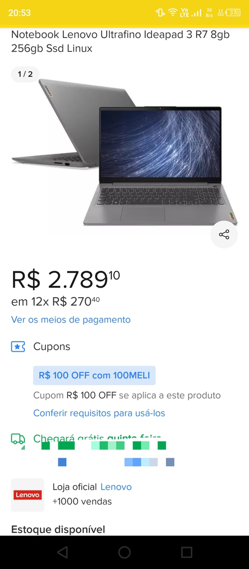 Notebook Lenovo Ultrafino Ideapad 3 R7 5700U 8gb 256gb Linux