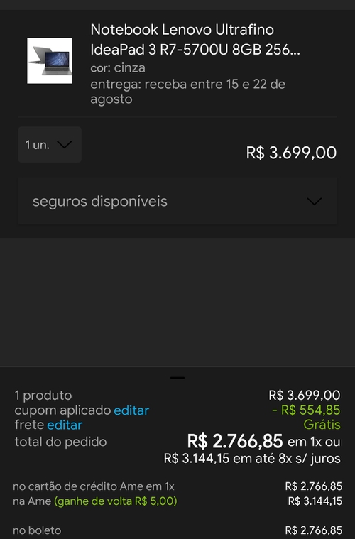 Tentei pelo link e pela pesquisa no APP e não chegava no preço. Entrei em configurações, aplicativos, limpei os dados e cache, entrei novamente no APP, busquei pelo notebook, cliquei em inserir o cupom, loguei minha conta, inseri o cupom e dessa vez funcionou.