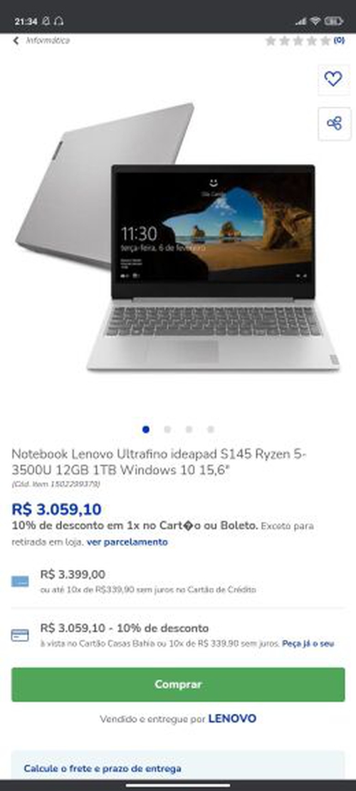 Notebook Lenovo Ultrafino ideapad S145 Ryzen 5-3500U 12GB 1TB Windows 10 15,6" R$3059