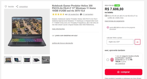 Notebook Predator Helios 300 PH315-54-70LH i7 11ª Windows 11 16GB 512GB ssd RTX 3070