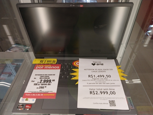 Sobre a promoção em si. Consegui comprar hj na loja do centro do Rio (Rua do Ouvidor) o Lenovo com R5. Por 2999 em 10x sem juros com 65% de cashback, 1950. Peguei o último, o do mostruário mesmo. O pessoal da loja nem sabe direito o que é SC, mundo ame, etc. Não dá pra usar saldo do AME, somente o cartão de crédito cadastrado no APP como principal. Vc vai em pagar, pagar na loja e abre um código de barras. A pessoa da loja lê o código de barras e ela que escolhe o parcelamento, vc msm não faz nada.