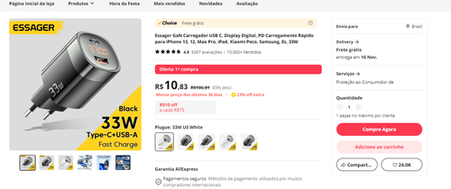 [NOVA CONTA] Essager GaN Carregador USB C, Display Digital, 33W