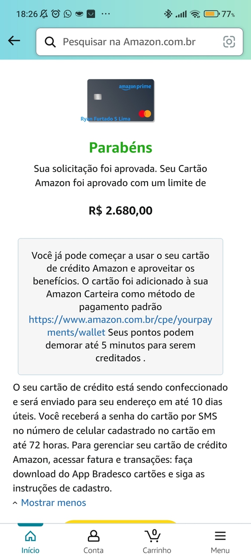 É inadmissível. Bancos como Inter e C6 que nem tenho investimentos me concedem cartão com R$ 50 mil. A Amazon tinha que ter escolhido o Itaú, por exemplo, que é menos burocrático e burro do que o Bradesco.