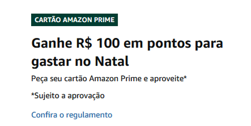 - A promoção dos cartões de crédito Amazon.com.br e Amazon Prime, válida das 00:00 do dia 09 de Dezembro de 2024 às 23:59 do dia 23 de Dezembro de 2024, beneficiará com o dobro de pontos de boas-vindas totalizando 20 pontos para clientes não-Prime e 100 pontos para clientes Prime, os clientes que solicitarem o cartão de crédito Amazon.com.br ou Amazon Prime e forem aprovados pela instituição financeira.
