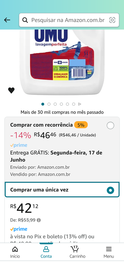 O preço em recorrência tá 47,49 e comprando uma única vez 43,55 não está mais o valor do post