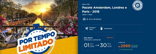 Pacote Amsterdam, Londres e Paris [aéreo + hotel] - R$2.999 (até 12x, cancelamento grátis)