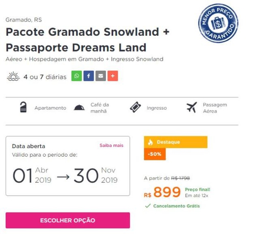 Aéreo + Hospedagem em Gramado + Ingresso SnowlandDatas:01 de abril de 2019 - 30 de novembro de 2019