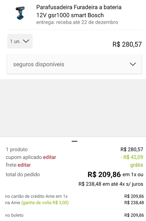 Comprei na promoção 12.12 da shopee desta mesma loja por 199,00, o kit com maleta e bits. Já comprei uma dessa pro meu pai há uns 4 anos e ela está perfeita e aguenta o tranco pra serviços gerais, só não indico alvenaria de concreto pq ela não tem martelete. Na Black surgiram algumas boas opções, mas preferi a bosh pela reposição de algumas peças e a facilidade de encontrar, tipo bateria e as escovas do carvão é ferramenta pra uma vida se bem cuidada.