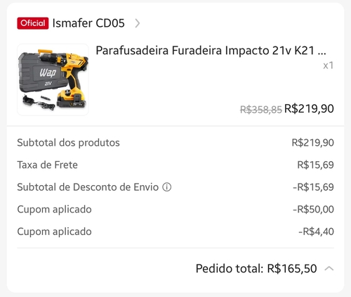 No carrinho ta um valor e na hora de finalizar sobe pra 212 reais. Shopee eh um lixo