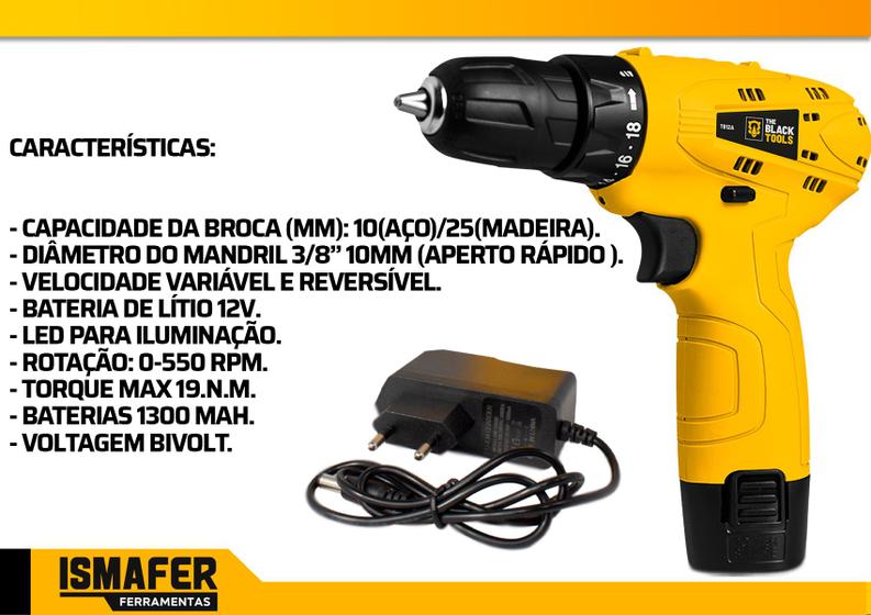 Parafusadeira Furadeira Sem Fio Bateria 12V Bivolt - The Black Tools