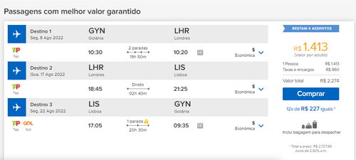 Algumas opções incluem bagagem para despachar, fique atento no momento da compra