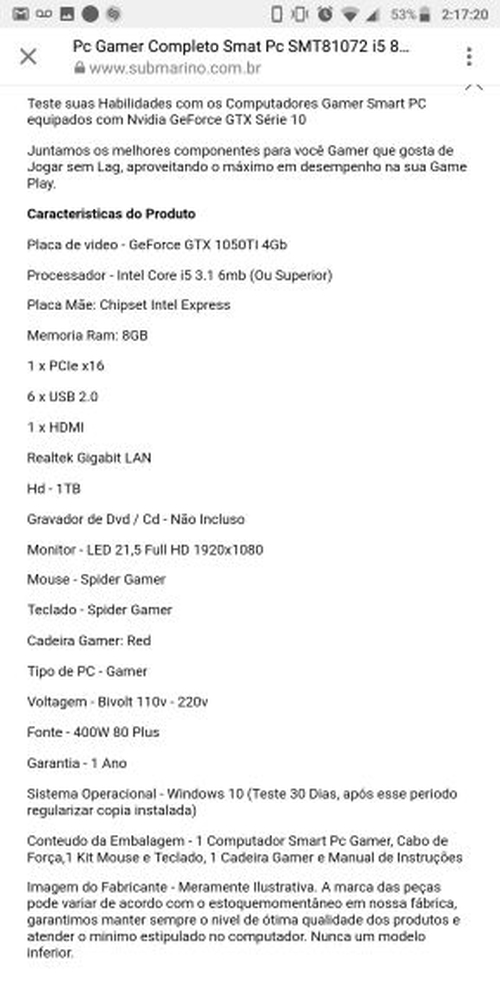 Pc Gamer Completo i5 8GB (Geforce GTX 1050TI 4GB) 1TB + Cadeira Gamer | R$ 3.619,90