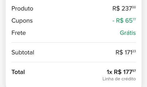 Usando esse cupom mais o desconto utilizando a opção de pagamento da linha de crédito(+15% de desconto) saiu por 177,57. 👀