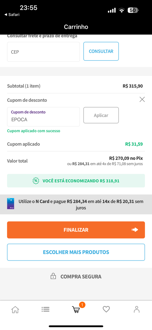 Usei o Cupom “EPOCA” na finalização e saiu 270 Pix 🤩