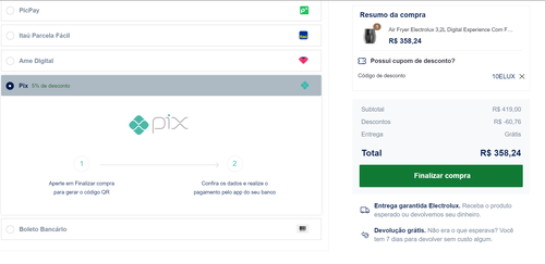 Tem a promoção no site promoelectrolux.com.br que te dá 80 reais no pix pela compra de airfryer