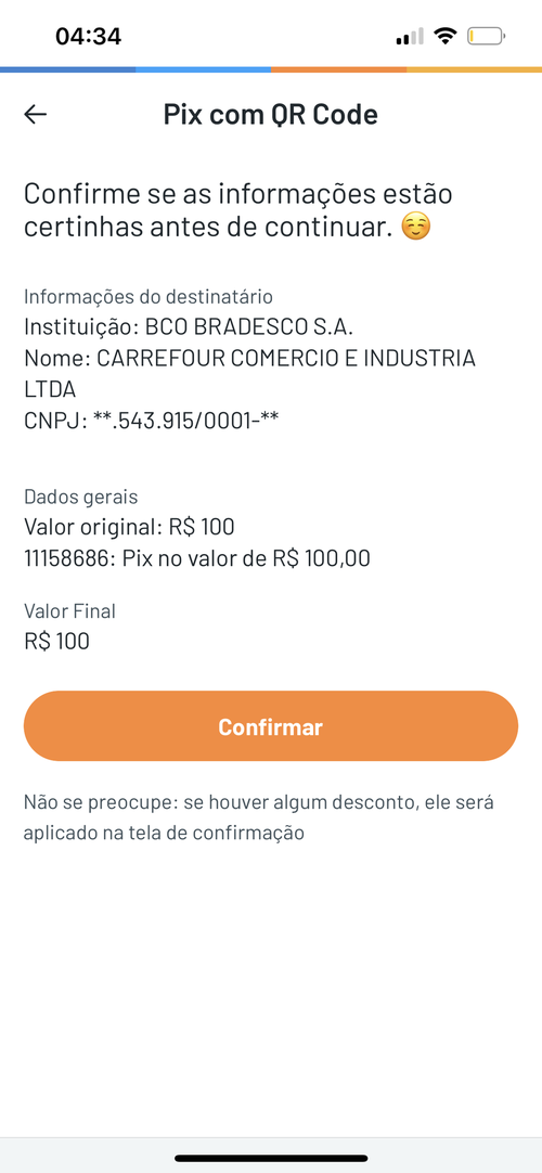 Aqui não aparece a opção Carrefour dentro do app e não deu certo simplesmente selecionando o pagamento por pix geral com QR Code
