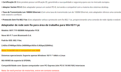 Placa de rede sem fio WiFi 7 Fenvi BE8800, Tri Band