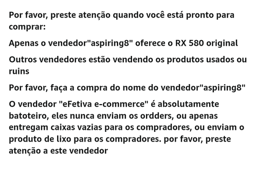 Amazon tá tão sacana pra enfiar essas podridão no c* do pessoal mais distraído que tirou a informação de compra internacional/tributos dessas bomba de marketplace na página direta do produto. O cara só tem a certeza que tá comprando muamba importada quando vê o produto na busca do site. Se é de comprar RX 580 importada que seja direto da fonte: Ali.