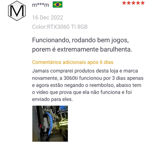 Esse vendedor tem avaliações ruins. Comprem da 51risc ou mlsse. A minha 3060ti da 51risc veio perfeita, igualzinha a nova. Não passa de 76C° nem a pau. Não tomei taxa.