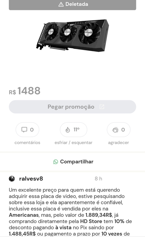 Estive tentando postar um anúncio dessa placa, mas, o Pelando não esteve aprovando o anúncio por dizer que não se trata de uma loja cadastrada, sendo que a placa está sendo vendida pela HD Store na Americanas e nesse anúncio aqui pela Amazon, a placa comprada diretamente pela HD Store está saindo com desconto de 10% no pix por 1.488,45R$ ou por 1.653,83 podendo parcelar em até 10 vezes de 165,38R$