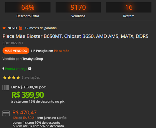 Tinha 16 unidades quando encontrei a promo. Placa mãe AM5 simples, mas pelo valor valia a pena.