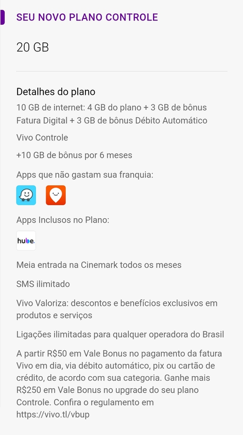Ainda tenho o plano q a vivo deu na migração automático da oi. 20 reais, 20 Gb.