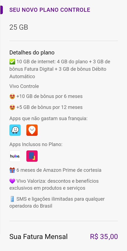 Plano Vivo Controle 25GB + 6 MÊS AMAZON PRIME