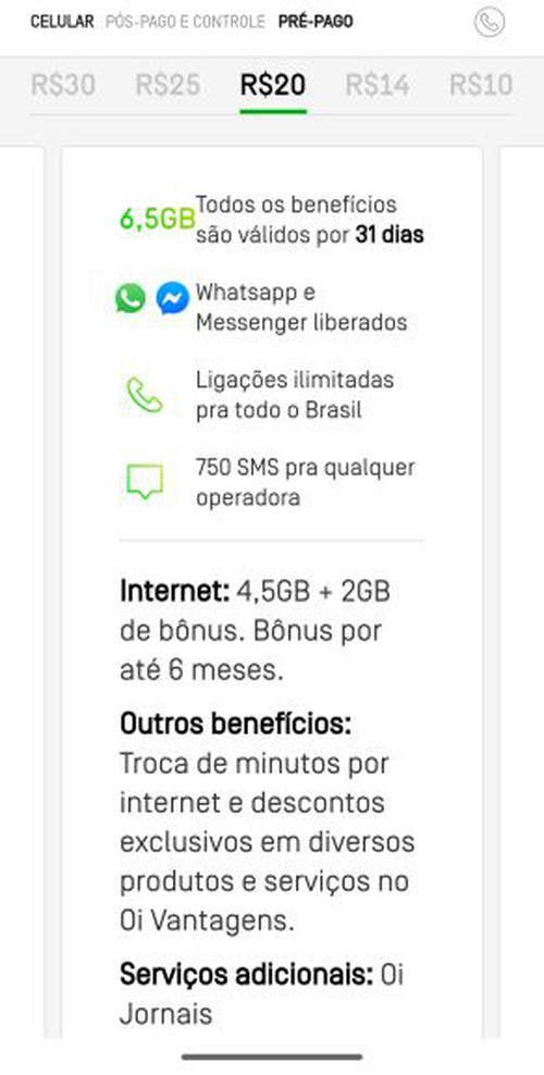 Pré da OI [6+ GB acumuláveis + WA + Messenger + DDD ilimitado qualquer operadora + 750 SMS]/mês
