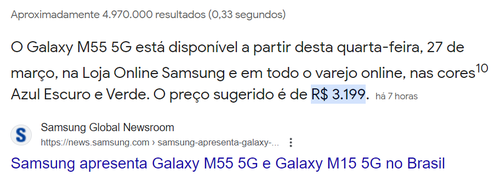 Já aconselho de antemão a não comprar o M55, vejam os reviews no YouTube. Tem um problema bem grave em relação a câmera (e devido ao processador, pode ser até crônico). Corpo todo de plástico, ao contrário do A55, que é de metal + vidro. E sem contar que o Snapdragon 7 Gen 1 perde pro Exynos 1480, que é do A55, inclusive em otimização de bateria, já que o Snap aí é fabricado pela própria Samsung.