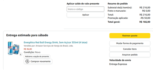 Adicionando 6 caixas do energético 355ml (Pacote de 4 unidades), fica um total de 216 reais, com o cupom 166 reais.