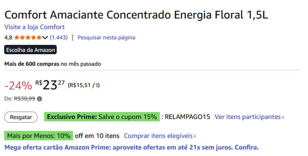 (PRIME) (R$17,14 / + Por -) Comfort Amaciante Concentrado Energia Floral 1,5L