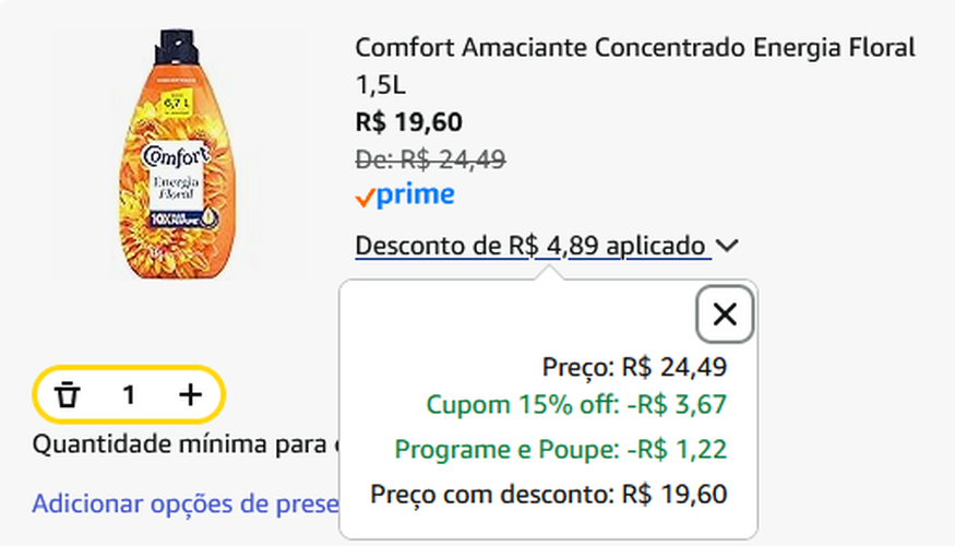 Se resgatar o cupom de 15% na página do produto, colocar recorrência e colocar 10 unidades, sai por R$17,14 cada um.
