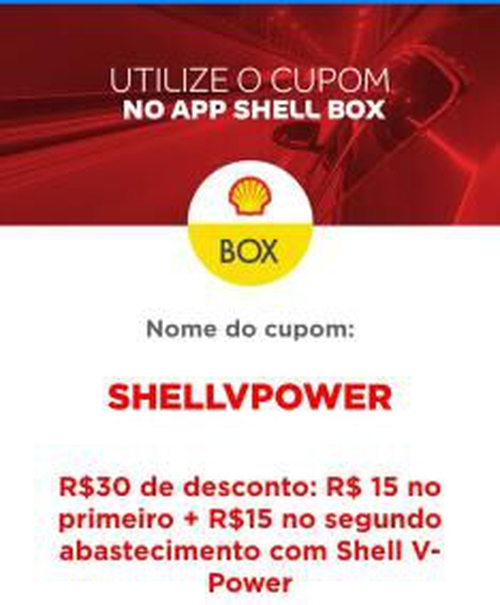 (Primeiro Abastecimento) R$30 OFF: R$ 15 no primeiro + R$15 no segundo abastecimento com Shell V-Power
