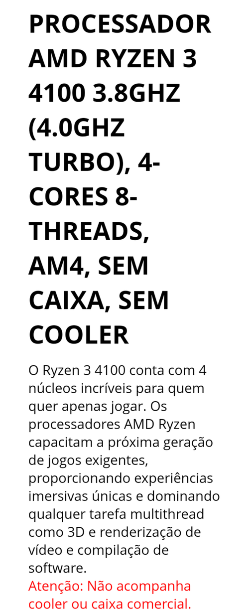 Processador AMD Ryzen 3 4100 3.8GHz + Cooler AMD Wraith Stealth, Sem vídeo integrado