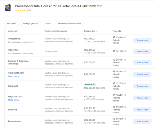 Tem o 9900k na Amazon por 2449 com frete grátis pra Prime. Mas só vale a pena se você já possui placa mãe compatível. Pra montar do zero tem opções bem melhores. https://www.amazon.com.br/Processador-Intel-i9-9900k-Refresh-Gera%C3%A7%C3%A3o/dp/B08KS9HNN4/