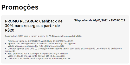 PROMO BITZ RECARGA: Cashback de 30% para recargas a partir de R$20
