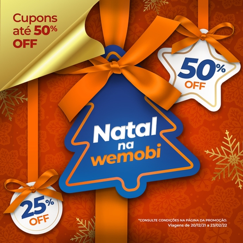 Promoção válida para compras realizadas de 16/12 ao dia 17/12/21 até as 23h59min, para viagens no período de 20/12/2021 a 23/02/2022, em qualquer dia da semana, em todas as classes, ida e volta, nas rotas selecionadas, sem limite de uso por CPF. Passagens adquiridas na promoção não permitem remarcação, somente cancelamento (veja regras aqui). Promoção não cumulativa. O cupom NATAL25 garante 25% de desconto para todas as rotas da wemobi.