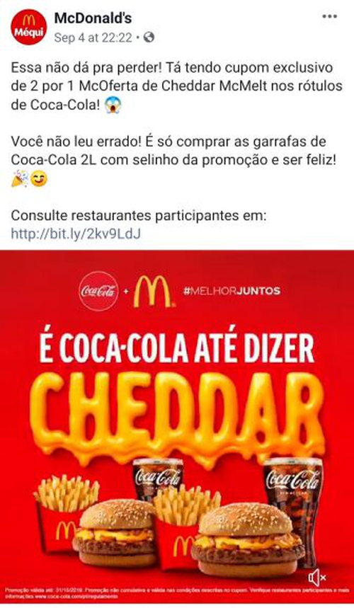 [Promoção] Compre uma coca 2L e ganhe 50% de desconto combo 2x1 Cheddar McMelt