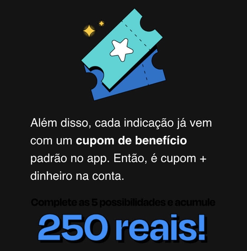 Nos dois casos (participando ou não) fica essa mesma tela, a diferença vai ser pq chegar e-mail e notificações no app falando pra vc convidar amigos e ganha 250 reais