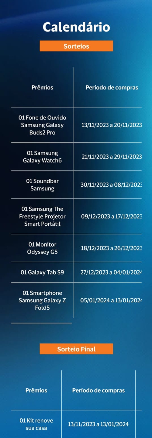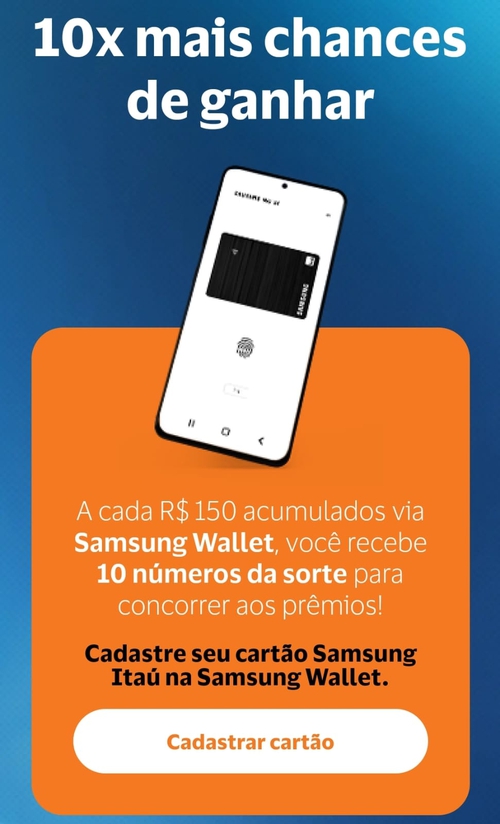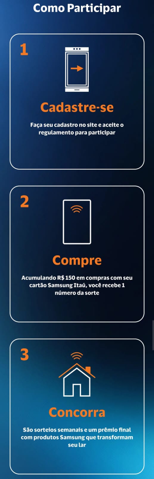 Podem participar da promoção: pessoas físicas, maiores de 18 anos, titulares de cartões Samsung Itaú Visa Platinum ativo, de crédito (puro crédito), físico ou virtual (temporário ou recorrente), de titularidade de pessoa física, nacional ou internacional, residentes e domiciliados em território nacional, que se cadastraram na promoção e preencheram todos os requisitos descritos no regulamento.
