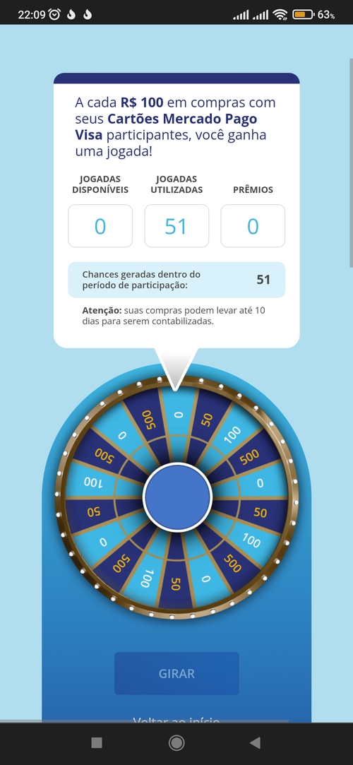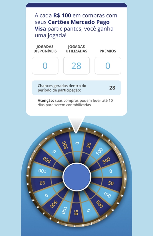 A cada 100 reais em compra com o cartão Mercado Pago, você ganha uma chance na roleta.