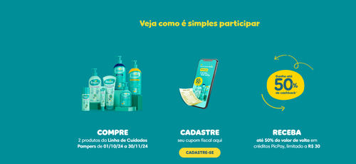 Promoção Carinho que volta - Compre 2 Produtos PAMPERS e Receba 50% de Cashback Limitado a R$30
