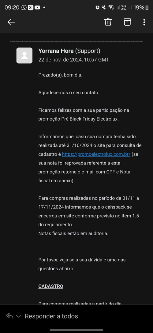 Comprei uma geladeira pra minha mãe dia 14/11, passou 1 semana e não tive resposta do cashback, aí mandei email me responderam isso :(