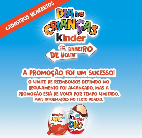 No Instagram da Kinder, a última postagem ainda fala de cadastros reabertos, embora no site conste a mensagem de reembolsos esgotados: