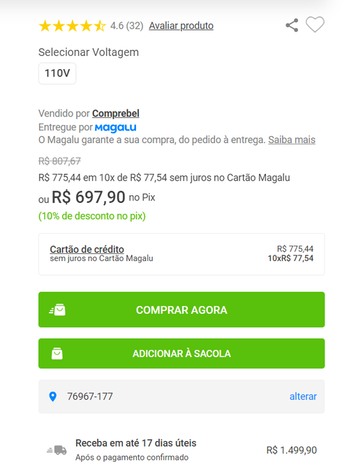 Na shopee tá 804 e tem cupom de 100, sai por 704,divide em 12x sem juros e tem 110 e220v