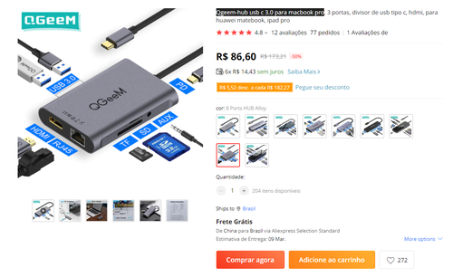 Qgeem-hub 8 portas para macbook pro, samsung dex e outros