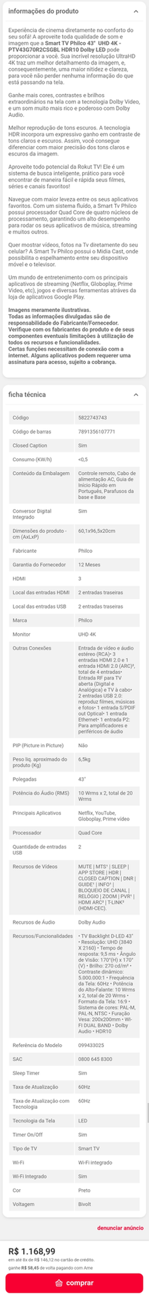 [R$ 1.110 AME] Smart TV Philco 43" UHD 4K - PTV43G70R2CSGBL HDR10 Dolby LED