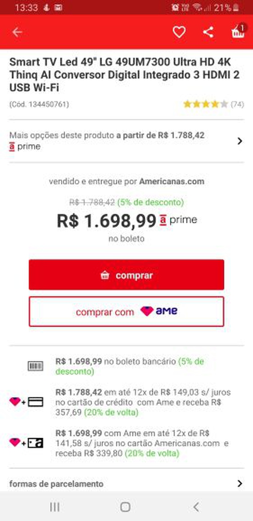(R$1.360 com AME e CC Americanas pelo APP) Smart TV Led 49" LG 49UM7300 Ultra HD 4K